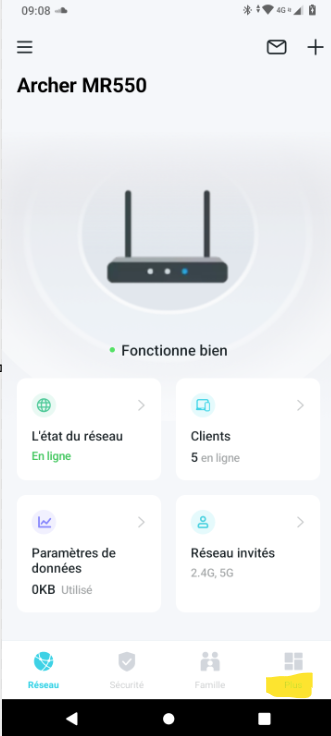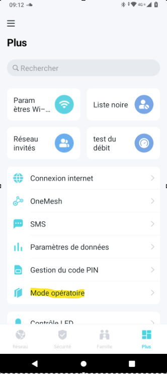 Une fois le routeur configuré avec l’application, aller dans l’icône « Plus » , puis cliquer sur « Mode Opératoire » et sélectionner « Routeur Wifi » au lieu de « Routeur 4G » :